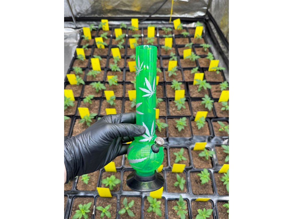 Małe akrylowe bongo wykonane z twardego plastiku. Bongo o 22 cm wysokości, jest zadrukowane liśćmi konopi. Akrylowe bongo idealnie nadaje się w podróż, ponieważ jest wykonane z tworzywa sztucznego i dzięki temu nie pęka tak łatwo. Plastikowe bongo to bardzo przystępna cenowo wersja fajki wodnej do codziennego użytku. Będzie Twoim wspaniałym towarzyszem w drodze na łono natury i na szalone imprezy.