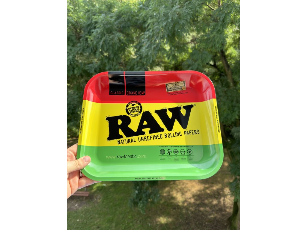 Ekstra duża metalowa tacka RAWSTA do zwijania mieszanek ziołowych z motywem marki RAW w kolorach rasta.