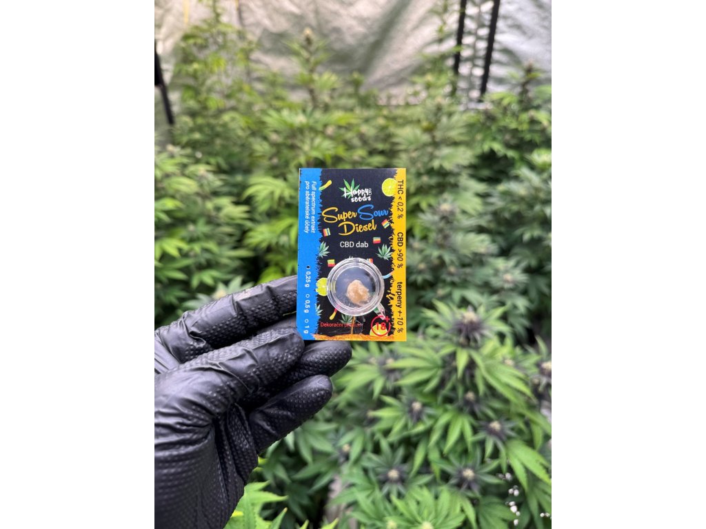 Dab o smaku Super Sour Diesel z zawartością CBD ponad 90%. Jest to dab o szerokim spektrum działania, co oznacza, że jest wykonany z całych roślin konopi, a więc jest bogaty w szeroką gamę kannabinoidów (CBD, CBG, CBC, THC) i innych składników, takich jak terpeny, flawonoidy, aminokwasy i woski roślinne.