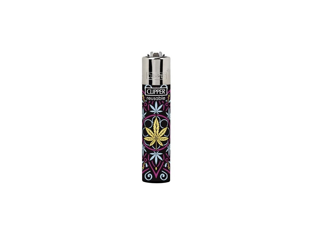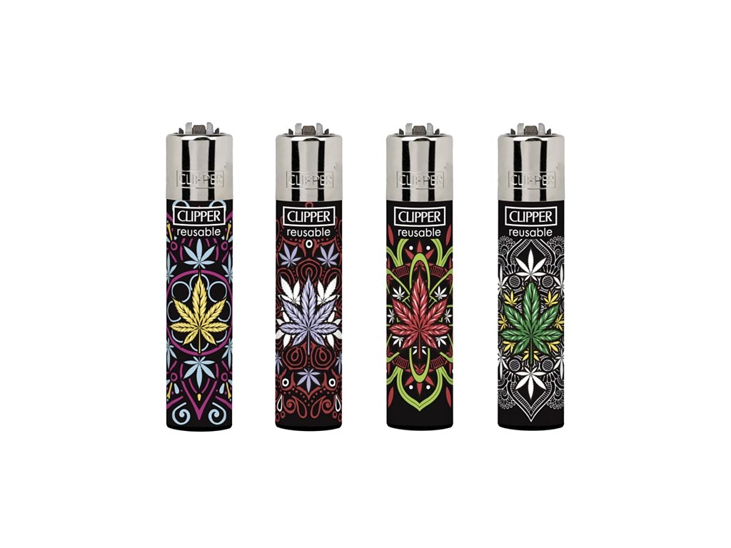 Zapalniczki Clipper z kolekcjonerskiej kolekcji High Mandalas. Zapalniczki są barwnie drukowane z motywami liści konopi i mandali.