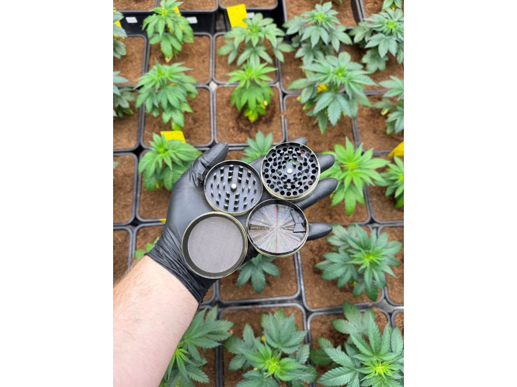 Wysokiej jakości metalowy młynek o średnicy 6 cm, sitko na kief oraz czwarta część do przechowywania już rozdrobnionych ziół. Młynek jest dostępny w dwóch kolorach. Młynek jest wykonany z wysokiej jakości materiału i ma bardzo ostre zęby, które ułatwiają rozdrabnianie suszonych ziół lub legalnej marihuany. Młynek posiada również popularne sitko do kiefu, które ułatwiają zbieranie żywicy z medycznej marihuany.