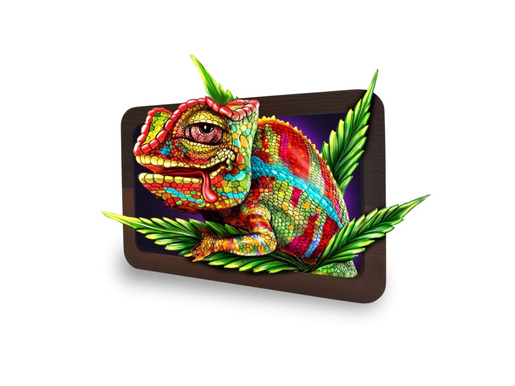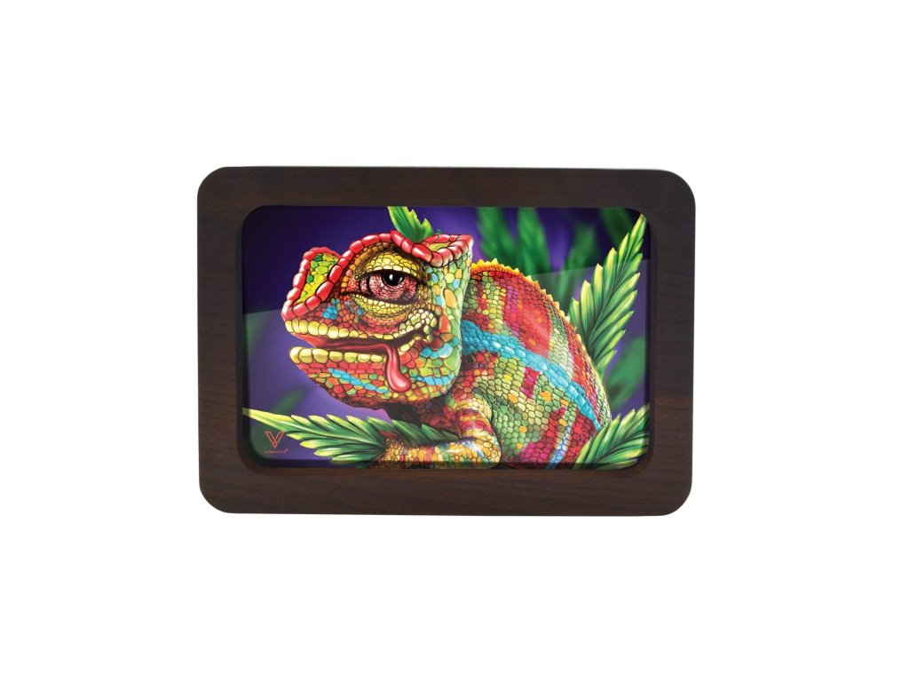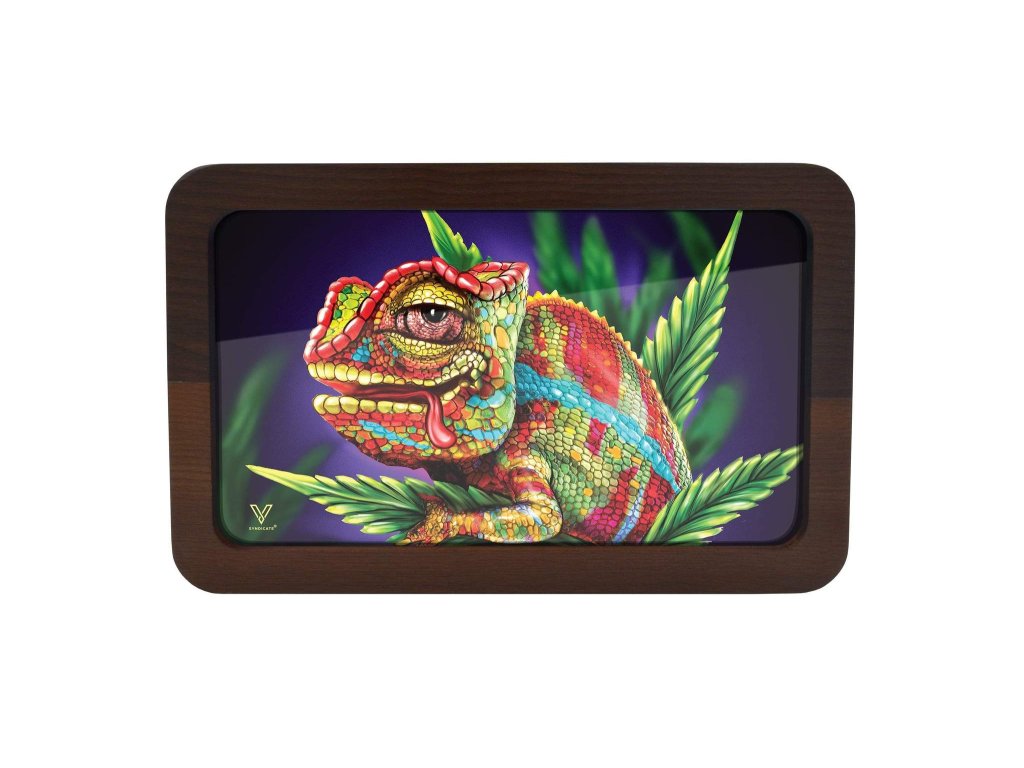 Duża wersja premium, luksusowej i niezniszczalnej podkładki do skręcania ziół od amerykańskiej marki V-Syndicate. Popularny motyw Chameleona umieszczony w drewnianej ramie, dostępny w dużym rozmiarze.