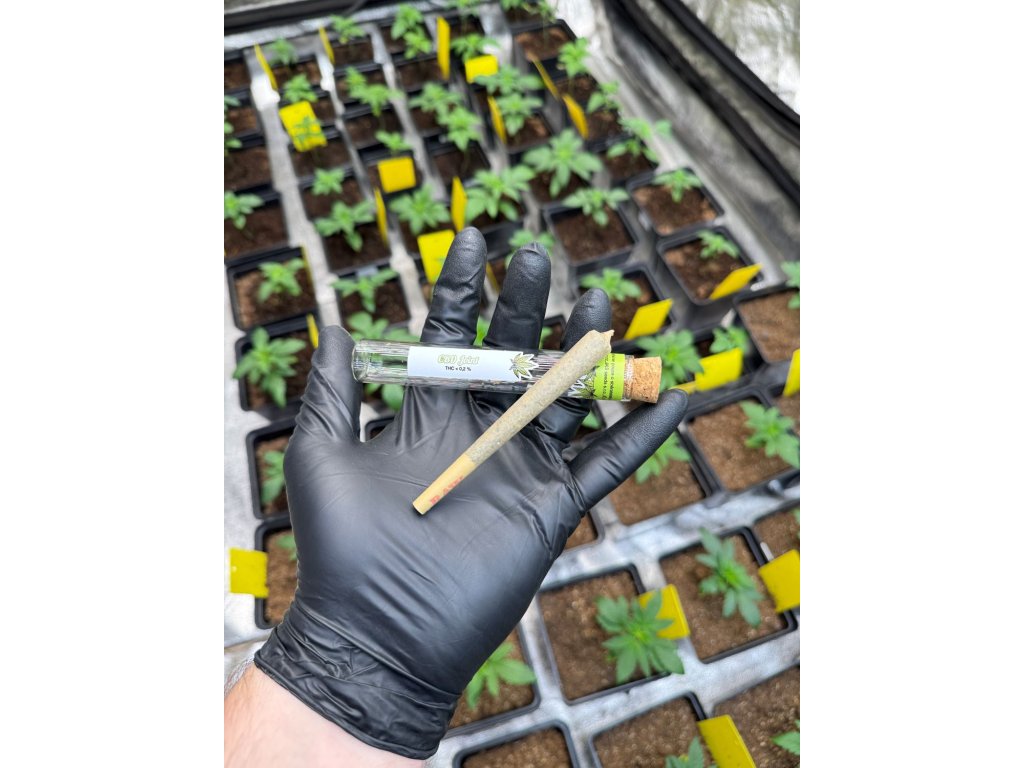 Wstępnie zwinięty joint z 7% CBD i 0,2% THC w zamykanym szklanym pojemniku king size 110 mm.