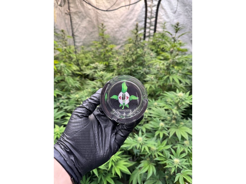 Szklana popielniczka z fajnymi motywami postaci liści konopi.