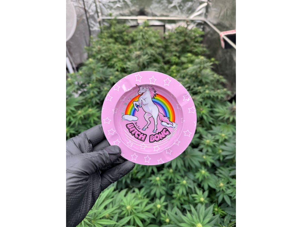 Metalowa popielniczka z motywem jednorożca w kolorze różowym od marki Black Leaf o średnicy 140 mm.