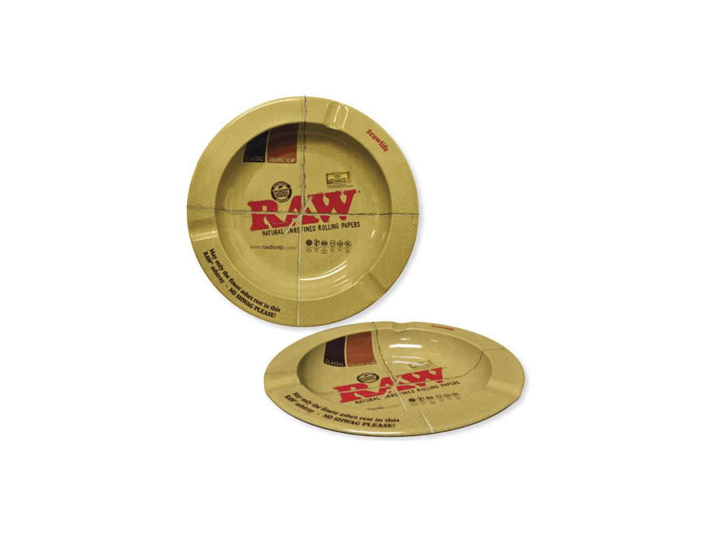 Metalowa popielniczka z magnesem i motywem 'RAW' o średnicy 140 mm.