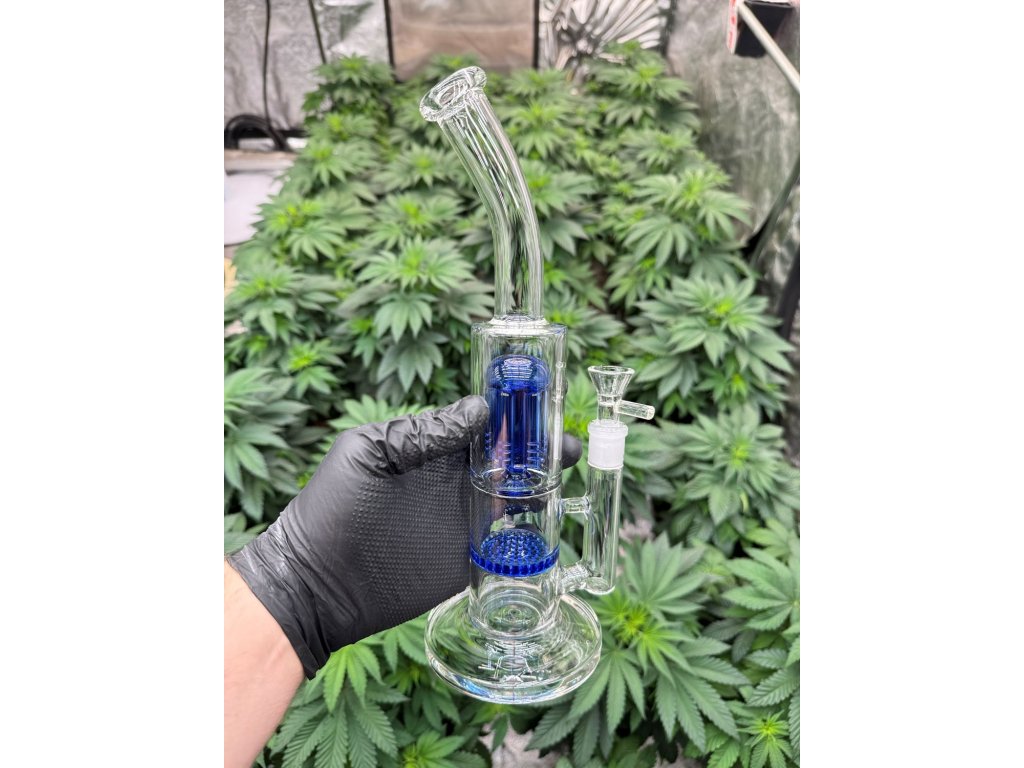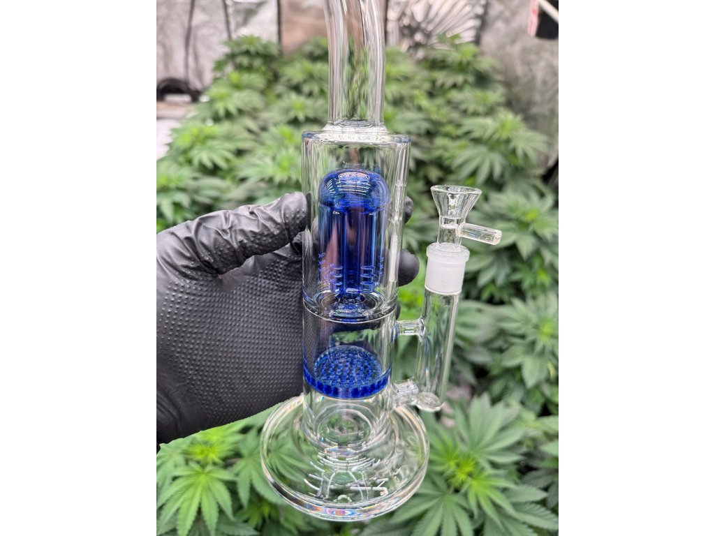 Szklane bongo o wysokości 31 cm z praktyczną wylewką i dwoma różnymi perkolacjami wewnątrz korpusu. Pierwsza perkolacja to popularna perkolacja plastra miodu, która należy do najpopularniejszych. Perkolator Honey Comb gwarantuje idealnie schłodzony dym. Druga perkolacja to perkolacja 6-ramienna, która jest najpopularniejszą i najczęściej stosowaną perkolacją w bongach produkowanych masowo. To średniej wielkości bongo jest uzupełnione cybuchem z praktyczną rączką o szlifie 14,5 mm.
