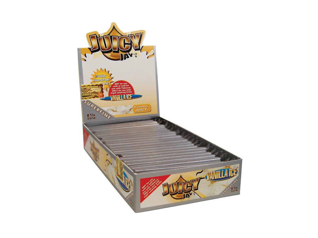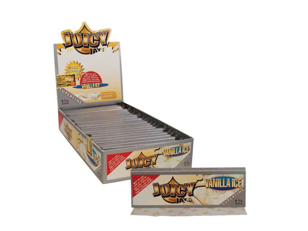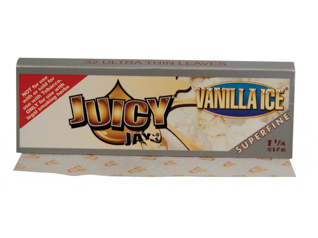 Bardzo popularne bibułki smakowe marki Juicy w rozmiarze 1 1/4. Te krótkie bibułki papierosowe mają smak lodów waniliowych i są wykonane z naturalnego materiału. Smak bletek jest całkowicie naturalny, a klej jest roślinny. Bibułki są zatem wegańskie lub Vegan friendly. Dodatkowo bibułki te są bardzo cienkie, a także posiadają znak wodny, który powoduje powolne i równomierne wypalanie.