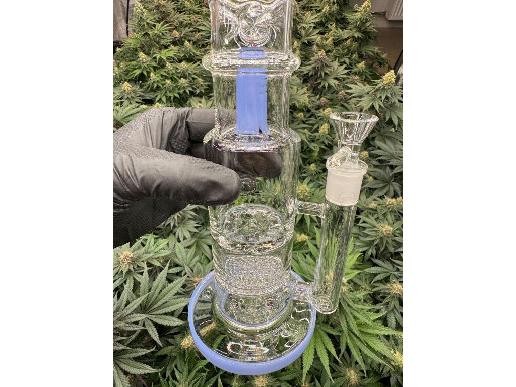 Szklane bongo lodowe z trzema różnymi perkolatorami . Dzięki potrójnej prekolacji w szklanemu bongu, wdychany dym zostanie jeszcze bardziej efektywnie zmiękczony i dużo bardziej łagodny