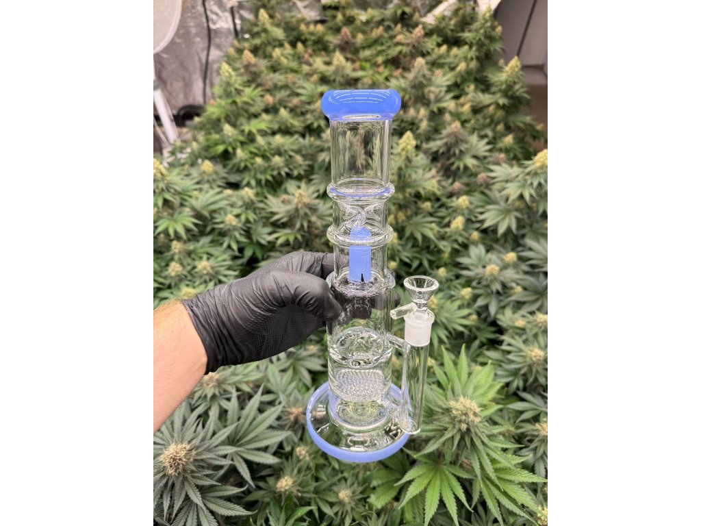Szklane bongo o wysokości 30 cm z trzema różnymi perkolatorami wewnątrz bonga. Kolory: zielony, niebieski i jasnoniebieski.