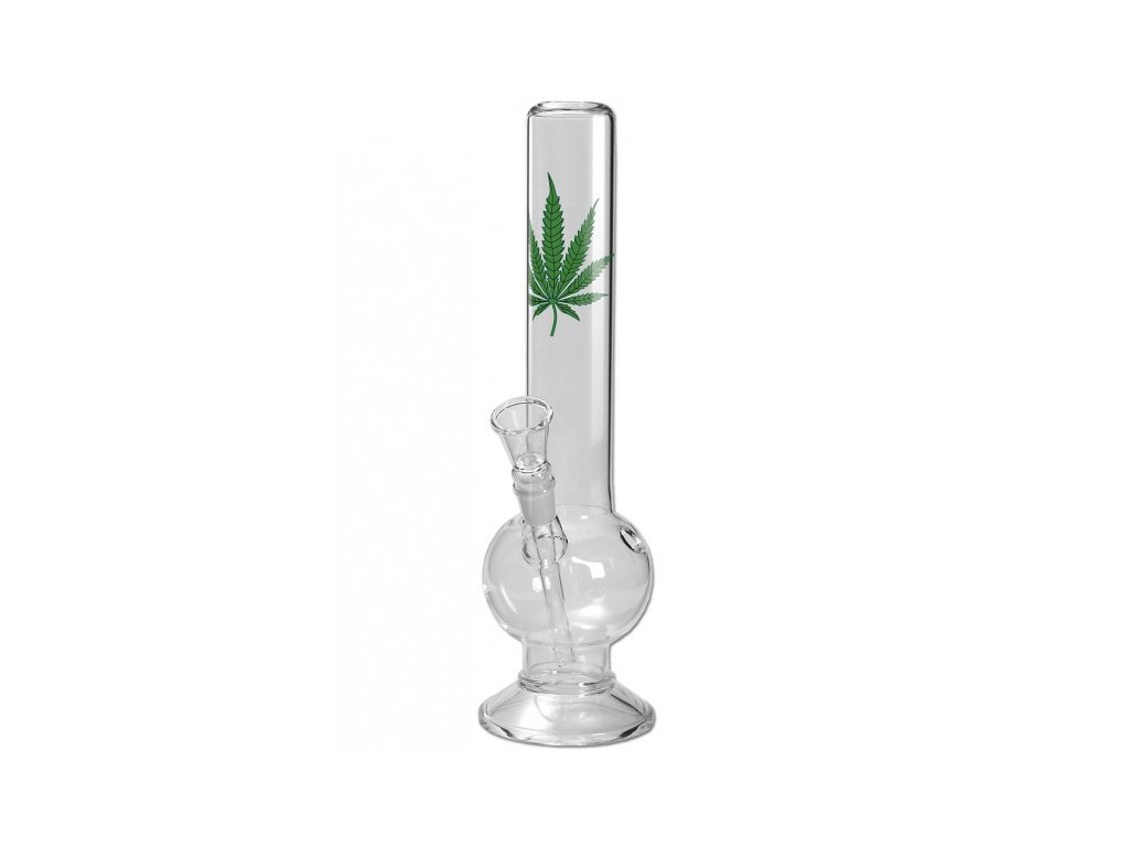 Szklane bongo o długości 40 cm zachwyci fanów większych bong. Wykonane jest ze standardowego szkła o grubości 3,2 mm. Dzięki prostemu kształtowi szklane bongo jest łatwe w czyszczeniu i konserwacji za pomocą odpowiedniego środka czyszczącego. To szklane bongo jest ozdobione motywem liści konopi.