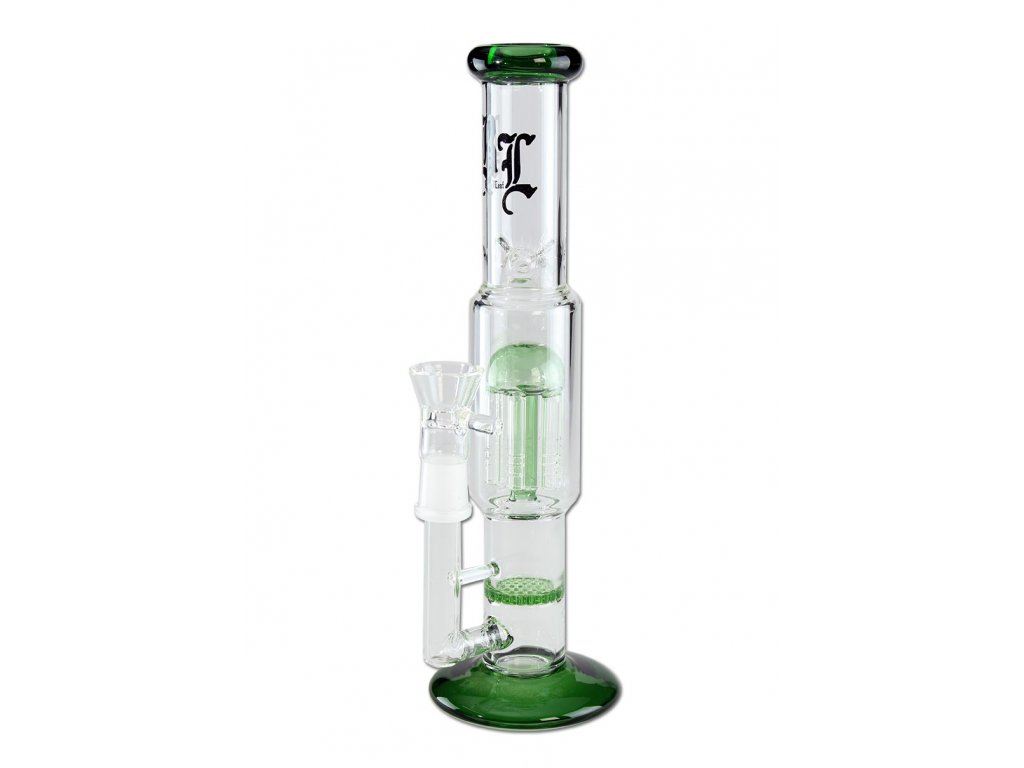 Szklane bongo lodowe o wysokości 31 cm z filtracją w kształcie plastra miodu i 6-ramienną perkolacją wewnątrz. Szklane bongo średniej wielkości z perkolacją w świetnej cenie. Fajka wodna w pięknej kombinacji kolorystycznej, gwarantuje luksusowy wygląd. Perkolator zdecydowanie minimalizuje ilość wdychanych substancji smolistych i nie podrażnia gardła podczas palenia. Ice Bongo wyposażone jest w wygodny cybuch.
