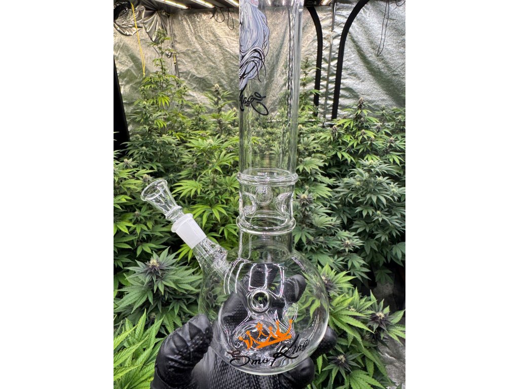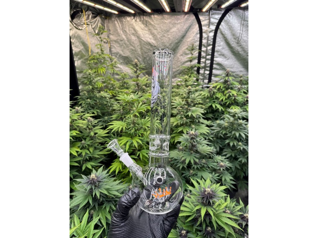 Szklane bongo do palenia z oryginalnym nadrukiem o rozmiarze 30 cm.