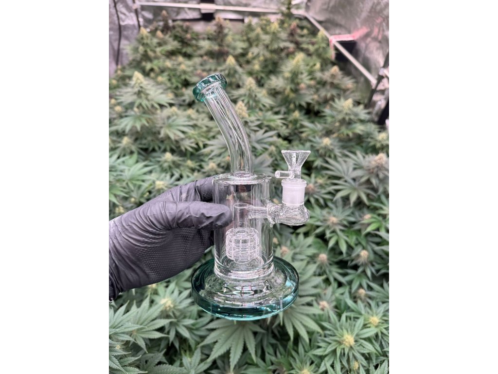Szklany bong o mniejszym rozmiarze z bardzo popularną perkolacją bębnową. Znajdujący się wewnątrz perkolator zapewnia doskonałe chłodzenie dymu. Do tego bonga dołączony jest szklany kociołek z praktycznym uchwytem. Mniejsze bonga można zabrać ze sobą wszędzie, nadają się również na mały prezent lub dyskretne bonga, które dzięki perkolacji dorównują większym bongom.
